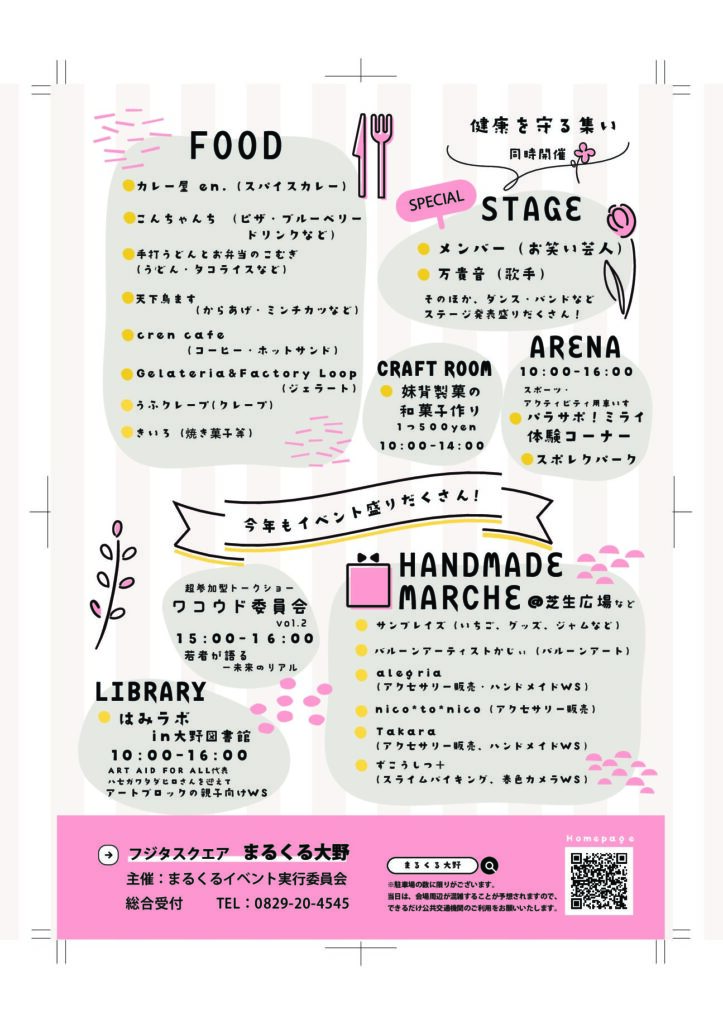 | 休館日 図書館及びスタディコーナー 12月29日〜1月4日 12月を除く毎月第4木曜日(その日が祝日の場合はその前日) 特別整理期間(年14日以内) 「フジタスクエアまるくる大野」の施設全館休館日 PC・ビジネスコーナー 12月29日〜1月3日 「フジタスクエアまるくる大野」の施設全館休館日 |