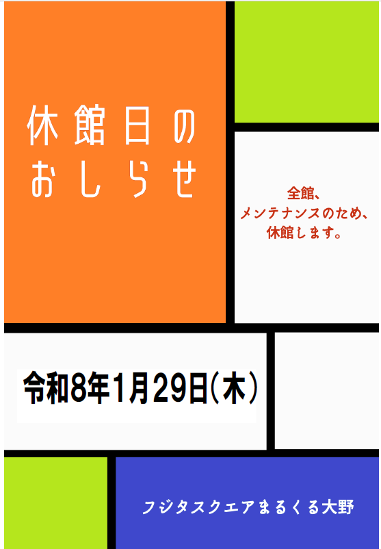 全館メンテナンス休館日のお知らせ(1月29日) 2025年9月3日 お知らせ 全館メンテナンスのため下記の日程で休館いたします。ご迷惑をお掛け致しますがご理解のほどよろしくお願いいたします。 日時:令和8年1月29日(木) 9:00~21:30