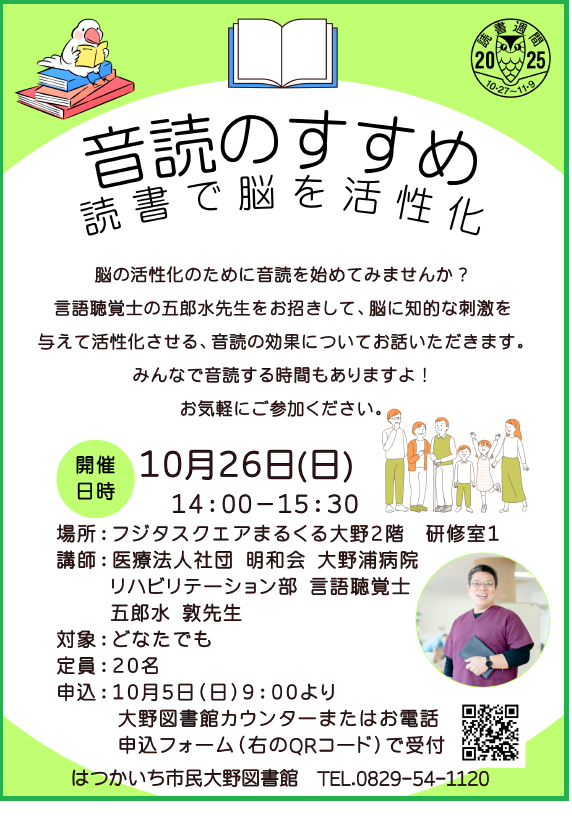 申込:10月5日(日)9:00から、大野図書館カウンター・電話・申込フォームで受付
