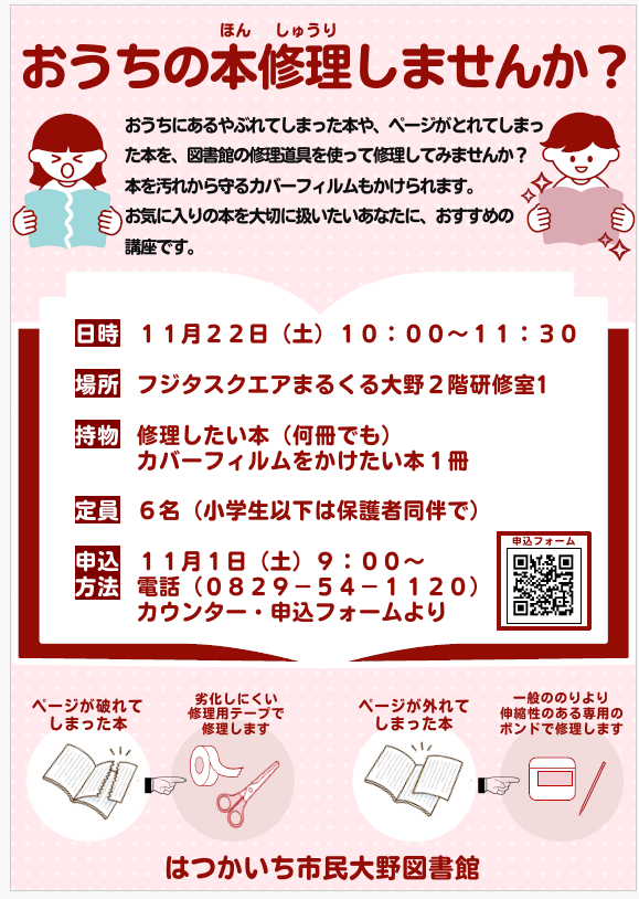 申込:11月1日(土)~大野図書館カウンター・電話・申込フォームにて受付