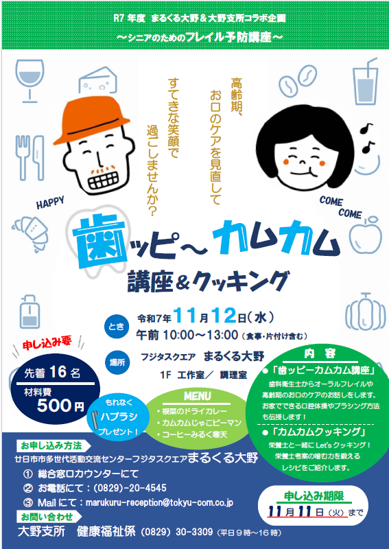 申込  まるくる大野総合受付へ電話・メールで申込みください