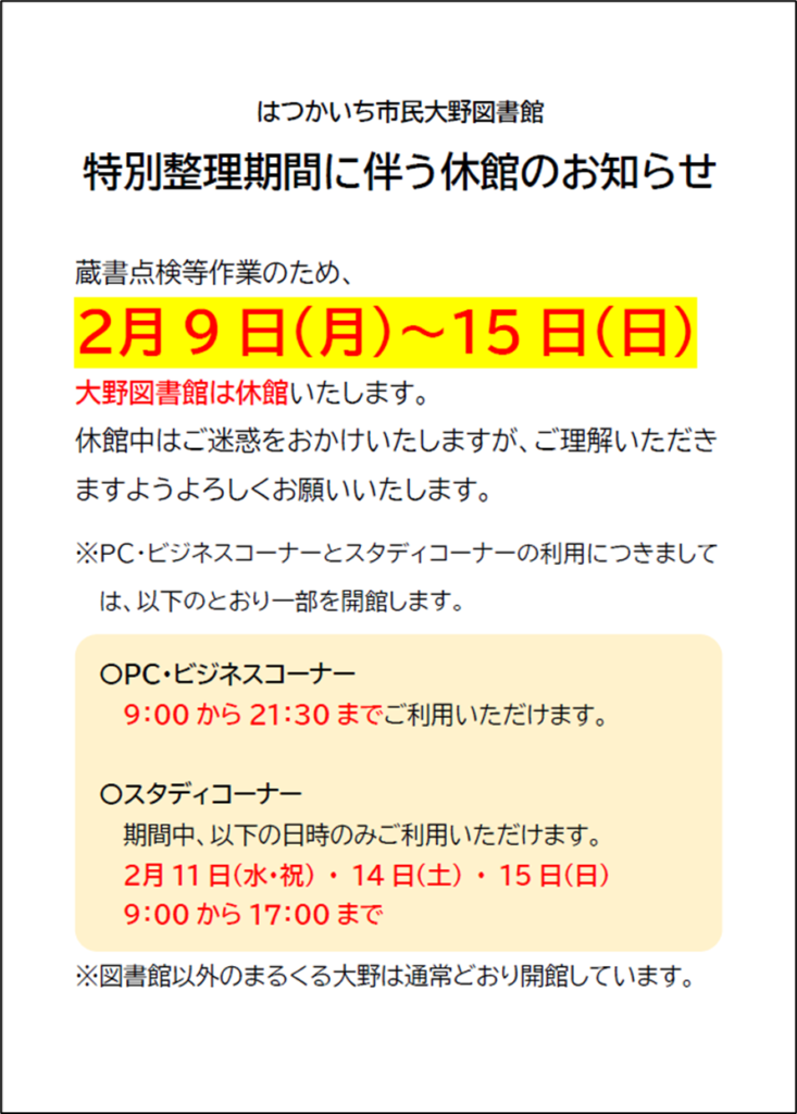 ※図書館以外のまるくる大野は通常どおり開館しています。